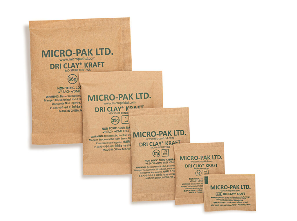 Micro-Pak Dri Clay®️ Kraft is a certified plastic-free desiccant made from natural bentonite clay that is packaged in biodegradable FSC (Forest Stewardship Council) Kraft paper. Dri Clay®️ outperforms synthetic desiccants and safely protects a wide range of goods from mold and moisture damage. Dri Clay®️ is the first and only desiccant with Plastic Free Certification from Control Union which confirms that it is a 100% plastic-free product.
